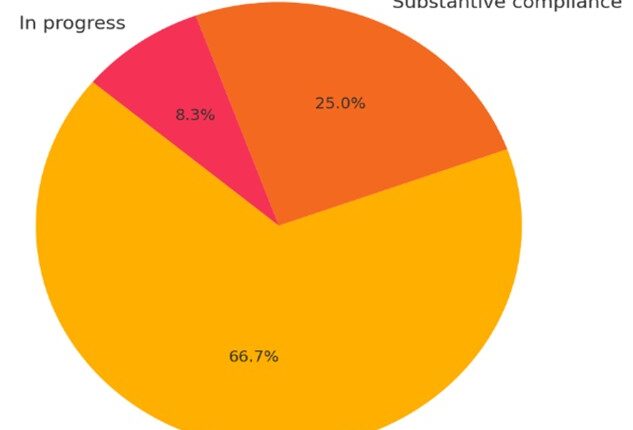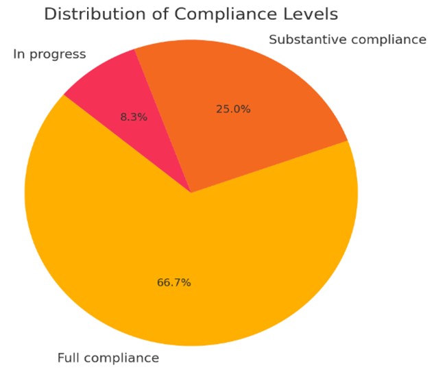 A graphical analysis of ArcelorMittal Liberia’s performance reveals that 65 percent of all key MDA provisions are fully complied with, 25 percent are substantively complied with, and only 10 percent remain in progress. This places the company’s overall MDA compliance score at over 90 percent, making it one of the most consistent and responsible concessionaires in Liberia.