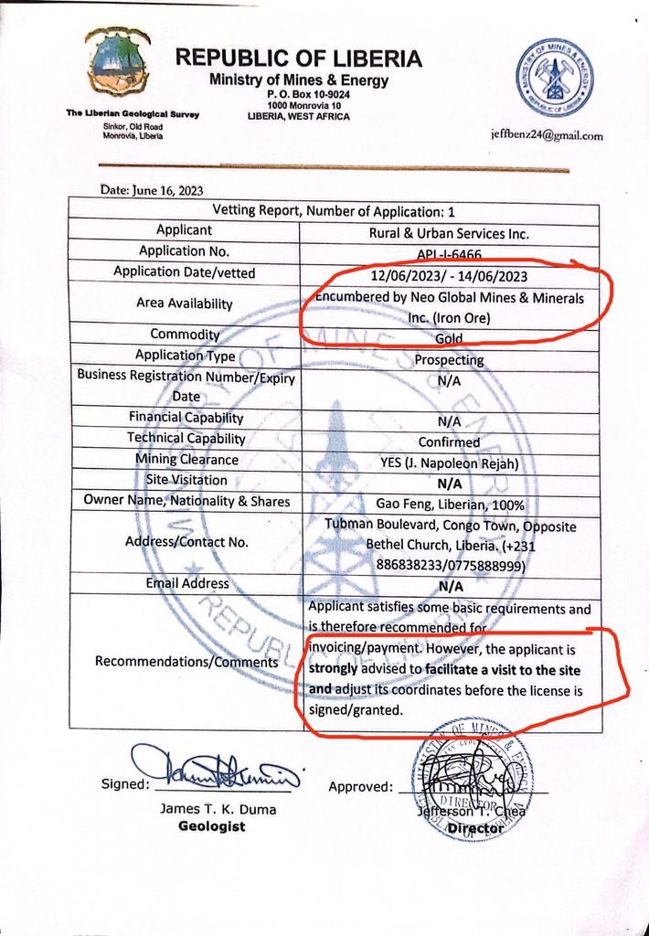 Information revealed to this paper is that, in June 2023 Feng “dubiously” obtained two Prospecting Licenses, PL10032423 and PL10032523, allegedly paying a staggering US$350,000 to officials of the ministry. The licenses are said to have overlapped the active exploration license of NEO Global Mines & Minerals Inc. in Belle Yallah Mining District, Gbarpolu County, which obtained its license on October 31, 2022 to operate in that particular area.