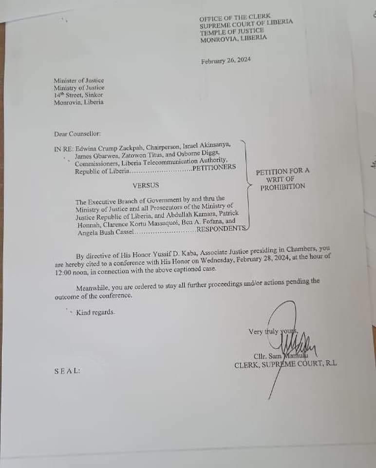 The commissioners then took the issue to the Supreme Court, and the court called for a conference on February 28, 2024 to hear the sides of both parties. The Justice in Chambers, His Honor Yussif D. Kaba, then ordered the Executive, through the Ministry of Justice, to stay all further proceedings and/or actions pending the outcome of the conference.