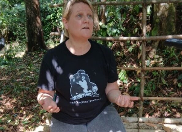 Dr. Annika Hillers, Director of the Wild Chimpanzee Foundation (WCF), is in a mourning garment for the Sapo National Park, ruined by illegal miners.