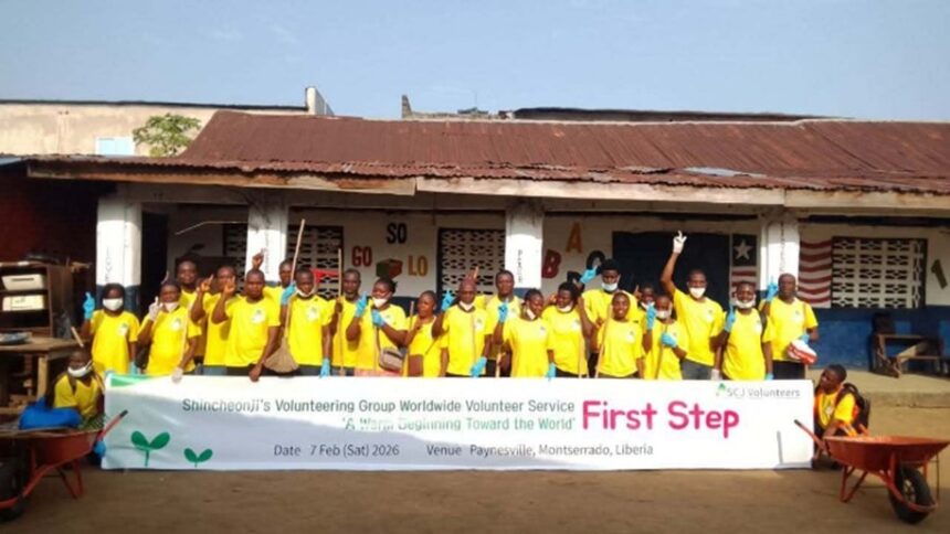 There was a huge turnout of volunteer members of SCJ Liberia during the launch of the clean-up campaign of the Du-Port Road Market on the first Saturday of February 2026. Volunteers wore yellow T-shirts and were seen with brooms sweeping, raking and putting the garbage in wheelbarrows, and dumping it in large black polythene bags for disposal.